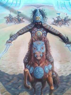 Картина воин Чингисхан с двумя мечами. Картина плакат размер высота 85 см, ширина 60 см,сделано ДВП масляная краска.