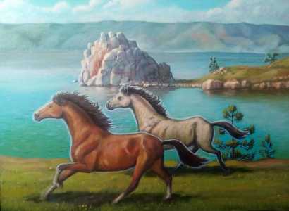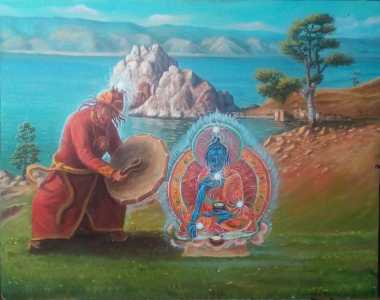 Мыс Бурхан на Байкале, шаман подаёт молоко в знак уважения и поклонения духам.