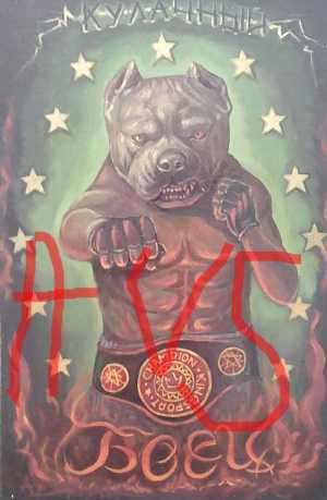 Уличный боец собака бультерьер. Картина плакат размер 85 см высота, ширина 55 см. сделано на ДВП масляной краской.