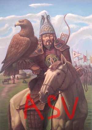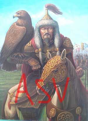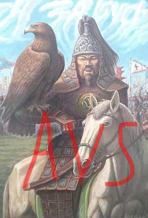 Чингисхан на лошади с орлом на руке. Позади его войны, его знамя орла именное. Вдали юрты его народа.