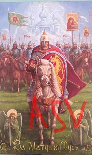 Полководец Александр Невский победил битву на реке Неве 1242 год. Позади войнов Церковь где светлые души войнов защитников.