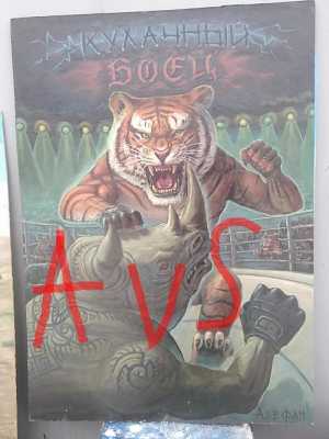 Кулачный боец тигр против носорога. Сделано на ДВП, масленая краска, размер полотна высота 85 см, ширина 60 см.
