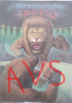 Кулачный боец лев против медведя. Сделано на ДВП масленая краска, размер высота 85 см, ширина 65 см.