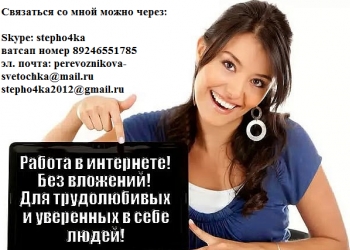 Требуются сотрудники для работы в интернете! Занятость 2-3 часа в день! Обучение бесплатное! Пишите в WhtsApp или Viber...