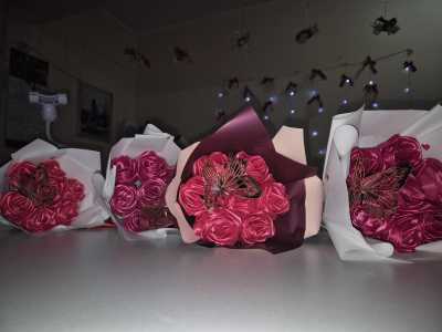 Розы из атласных лент,1шт 800 ₽ Букет из бабочек 800 ₽ Сумка из бусин 1500 ₽ Изготовление свечей 300 ₽ Подарок...